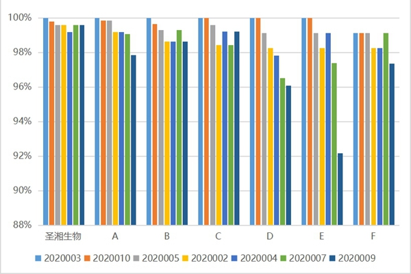 SARS-CoV-2结果阳性样本7个,浓度在3.5×103到3.5×106copies/mL之间,可反映试剂对不同浓度阳性样本的检出情况,从一定程度上反应试剂盒的检测能力(重复性、灵敏度、准确度)。各样本不同试剂检测结果符合率如图: